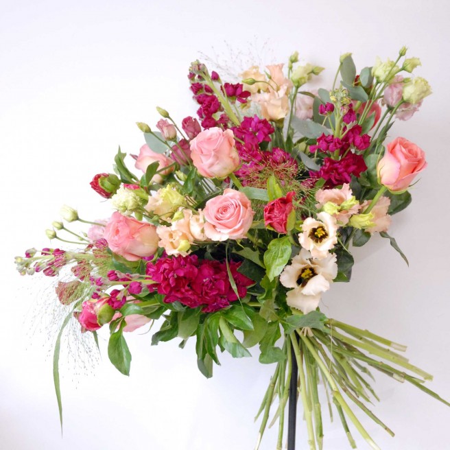 Ein Camaïeu aus Rosen und Feldblumen. Eine subtile Kombination aus Wildkräutern, Lisianthus, Nelken, Gräsern und Rosen für einen zarten, raffinierten und romantischen Strauß.