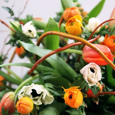 Spielerischer Strauß aus saisonalen Blumen, aufgelockert durch tanzende Zweige.