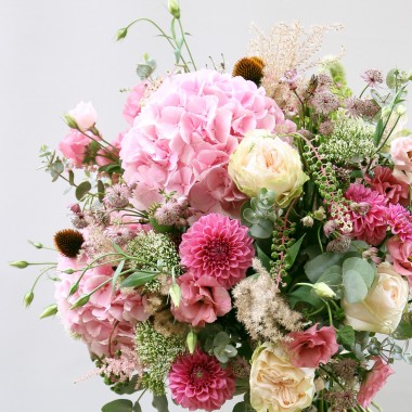 Wild greens and grasses, graceful lisianthus buds, lacy hydrangeas, pale silk-petaled roses and delicate dahlias are combined in a voluble bouquet, similar to an English garden. The result is lightness!